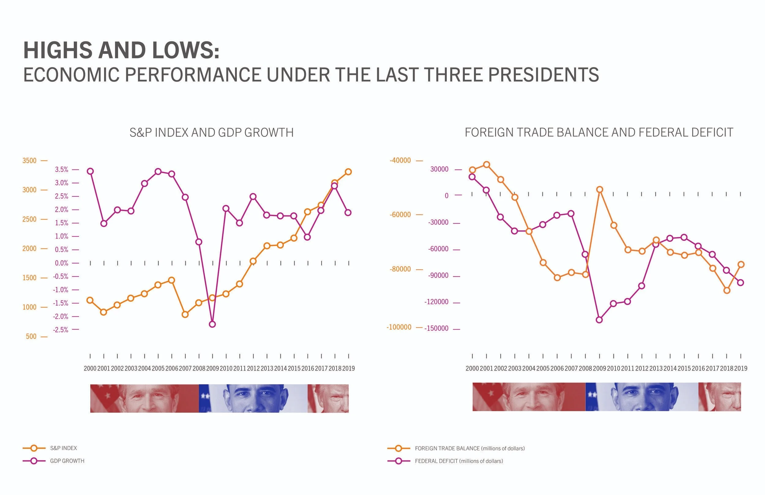 These graphs show the trends in the economy from 2000-2019 in terms of the S&P Index, GDP Growth, Foreign Trade Balance, and the Federal Deficit under the current and previous two presidents. The purpose is to inform about the health of the economy because voters tend to vote for presidents if the economy is thriving. Tracking the progress of the economy for the previous two and the current president helps to identify that the economy is its own entity, and policies are formed because of the economy. Economy Graph was designed and developed by Ria Parikh.