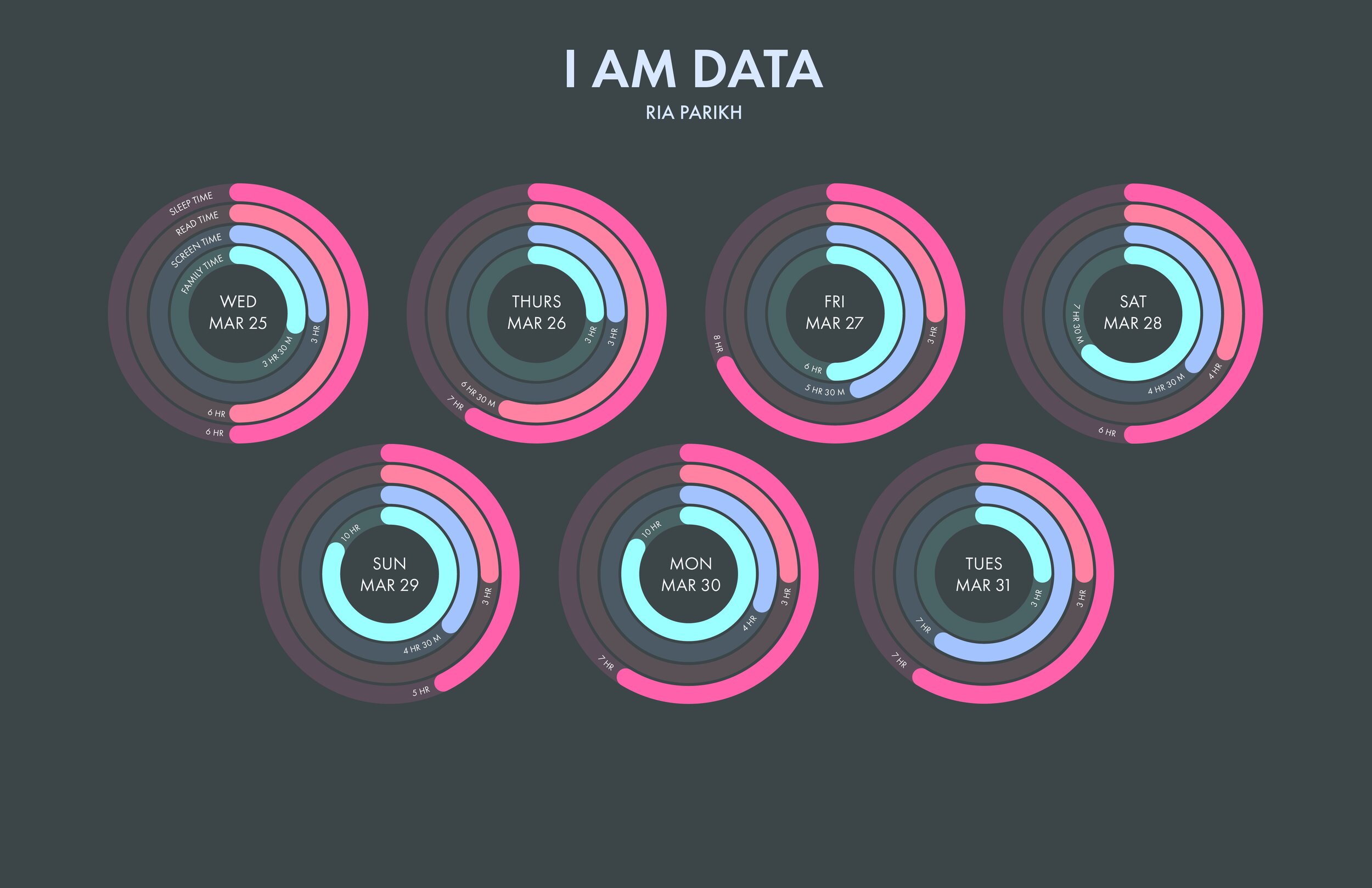 The purpose of the I Am Data project was to describe myself in terms of data. During the COVID-19 quarantine, I tracked four important areas in which I spend the most time. Those four areas included: sleep, reading, screen, and family time. These graphs indicate the amount of time I spent in those four areas during a week of my life in quarantine. I Am Data visualization was designed and developed by Ria Parikh.